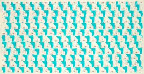 DescriptionIn der Zeit als das Bild "Nil" entstand, beschäftigte ich mich intensiv mit seriellen Malereien, die mit Eitempera Farbe auf sägeraue Holzlatten aufgetragen und dann zu raumgreifenden Installationen zusammengebaut wurden. Ausgangspunkt für die Bildmotive dieser Serien waren comic-artige Zeichnungen, die bei unterschiedlichen Gelegenheiten jeweils direkt vor Ort entstanden. Die Arbeit "Nil" ist einerseits auch ein Ergebnis dieses Ansatzes, andererseits aber eine der wenigen Ausnahmen, bei denen ich kurzzeitig Leinwände oder große Papiere als Bildträger nutzte und die Vervielfältigung der Einzelmotive mit Hilfe eines mehrfarbigen Druckverfahrens mit selbstangefertigten Schablonen und Acrylfarbe vorgenommen habe. Von den bei Arbeitsbeginn geplanten Schablonen-Druckdurchgängen ließ ich oft einige weg. Das ursprünglich gegenständliche Bildmotiv wurde z.B. bei "Nil" auf eine Art von Bildzeichen reduziert und auf Grund meiner eigenen Assoziation zu Hieroglyphen ergab sich sozusagen mit einem Augenzwinkern der Bildtitel.