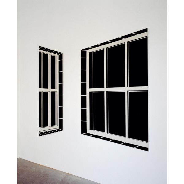 DescriptionDie Arbeit zeigt ein Fensterpaar, das direkt auf den umgebenden Galerieraum, indem es gezeigt wird, bezogen ist. Das Fenster als Bauteil, Objekt und Symbol vereinigt viele paradoxe Bedeutungsebenen: es steht für Transparenz und zugleich für Abgrenzung nach Außen. Es fungiert als eine Art Membran. Das Fenster als Archetyp steht ebenso für den privaten Einblick in einen Raum, wie auch für den zielgerichteten Ausblick; es lässt Licht in das Gebäude ein, indem es aus „Nicht-Wand“ besteht, es steht also zugleich für Materie und Nicht-Materie; das Fenster symbolisiert beide Seiten unserer Wahrnehmung, das Innen und das Außen. Das Ausgangsmotiv eines Fensterpaares der Galerie wurde mit Hilfe von abdeckenden Klebebändern als „Einweg-Schablone“ auf die zugeschnittenen, parallelogrammförmigen, weiß grundierten Paneele übertragen. Mittels schwarzer Kohle wurde das Bildmotiv sichtbar gemacht.