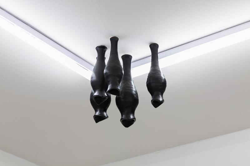 DescriptionZu sehen sind fünf schwarze Vasen, die von der Decke hängen. Ihre Silhouetten und die kleinen Ausbuchtungen an den Hälsen, erinnern an eine Gruppe von Fledermäusen, die kopfüber ruhen.Text: Künstler