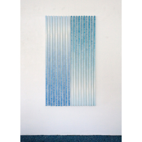 Die Idee zu den „Stangenarbeiten“ entstand daraus, daß ich mir vorstellte, eine Bildfläche in senkrechte Streifen zu zerschneiden. Die so entstandenen „Stäbe“ sind nun einzeln zum montieren, der Abstand zwischen den Stäben kann allerdings nun verändert werden und die Arbeit kann die Raumkonstellationen bzw. andere Bedingungen besser reflektieren.